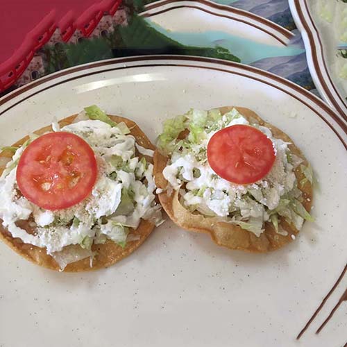 Tortilla de maiz hecha a mano servida con su eleccion de came, lechuga y jitomate, crema y queso.